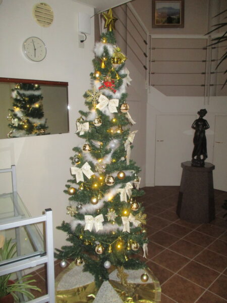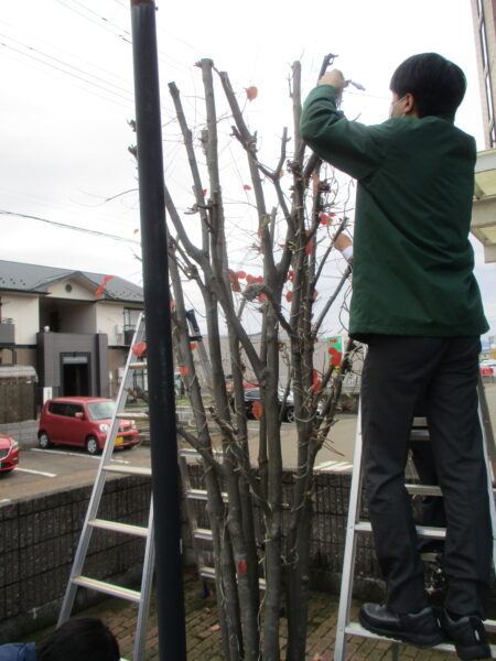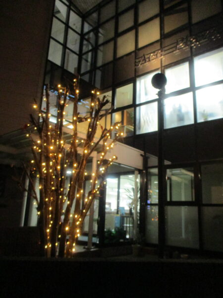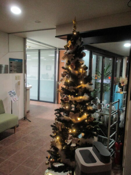 2022年11月イルミネーション・クリスマスツリー by ace-group on 2022年11月16日 with コメントはまだありません 【イルミネーション取付】 来月はいよいよクリスマス、今年も北側玄関の落葉樹 ヤマボウシにイルミネーションの取付を行いました。 ヤマボウシの葉はほとんど落ちていました 脚立を使ってLEDライトを枝に括り付けていきます 今年入社のO君に先輩が設置方法を伝授 綺麗に仕上がりました。Hさん、Oさん、Tさん寒い中ありがとうございました! 【クリスマスツリー】 ホールにクリスマスツリーを飾りました。 今年も素敵なツリーが玄関に展示してあります ライトアップした様子です