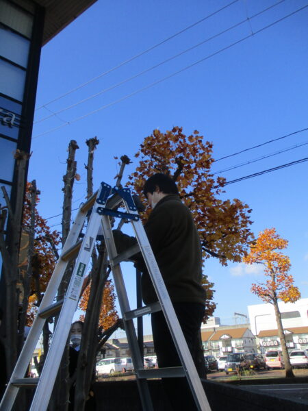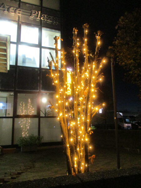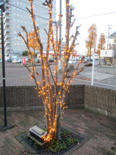 別日で若手社員の3名が、本社本館入口にある「やまぼうし」の樹にイルミネーションを設置しました★