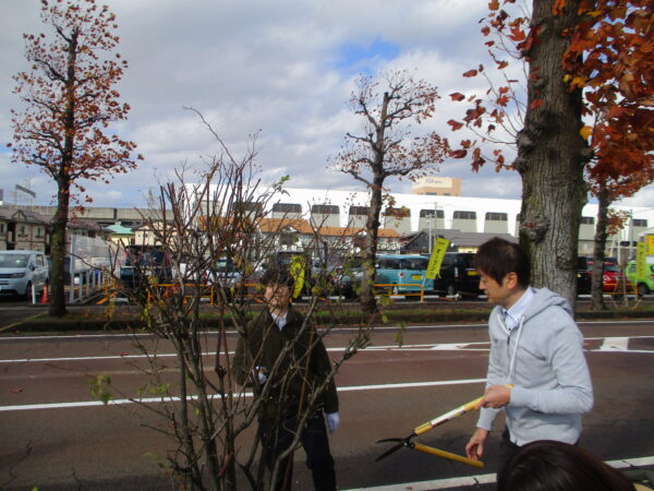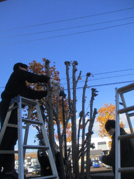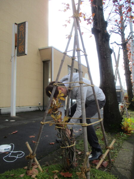 消雪用ホースを駐車場に設置したり、街路樹の冬囲いを行います。